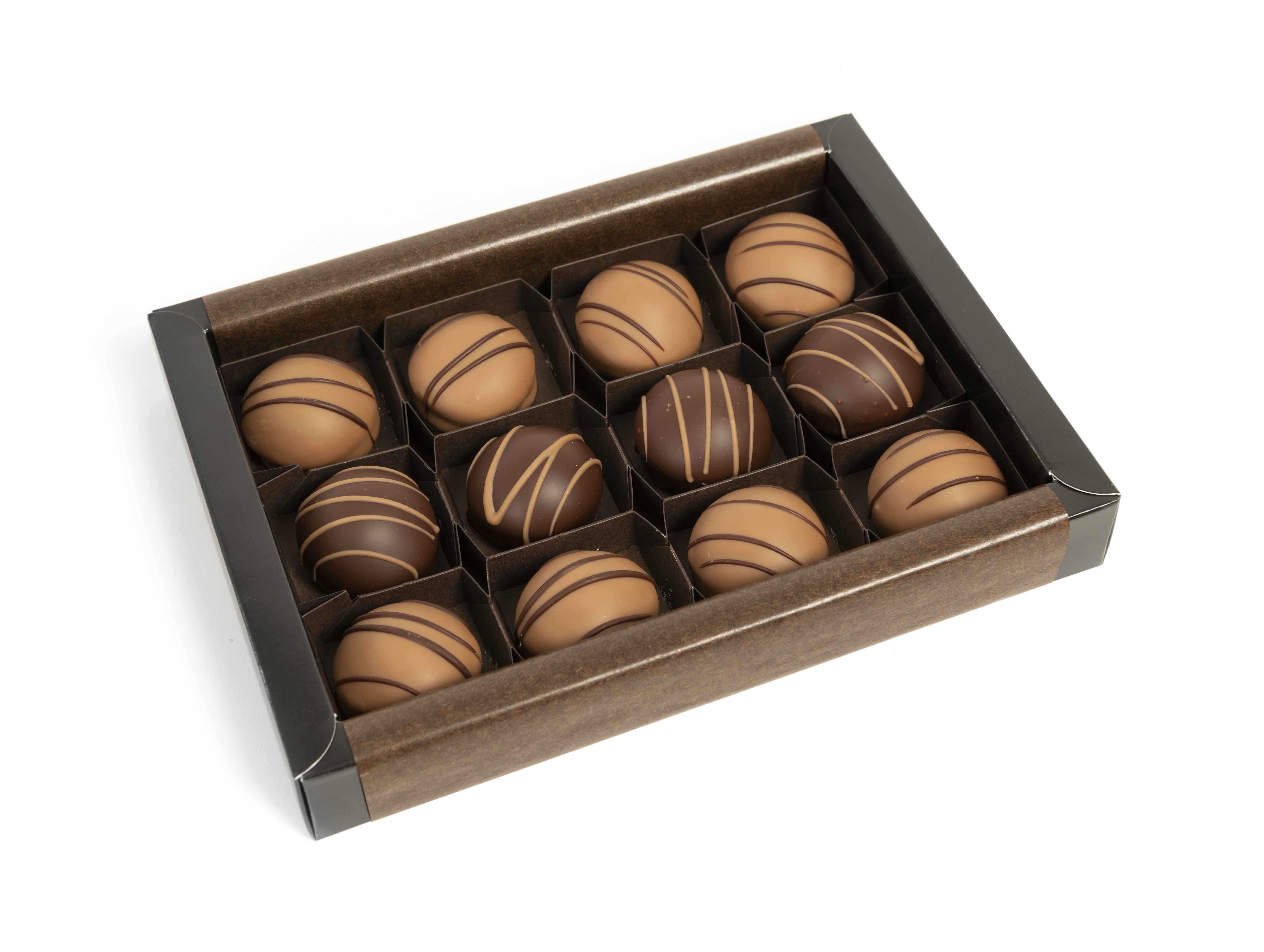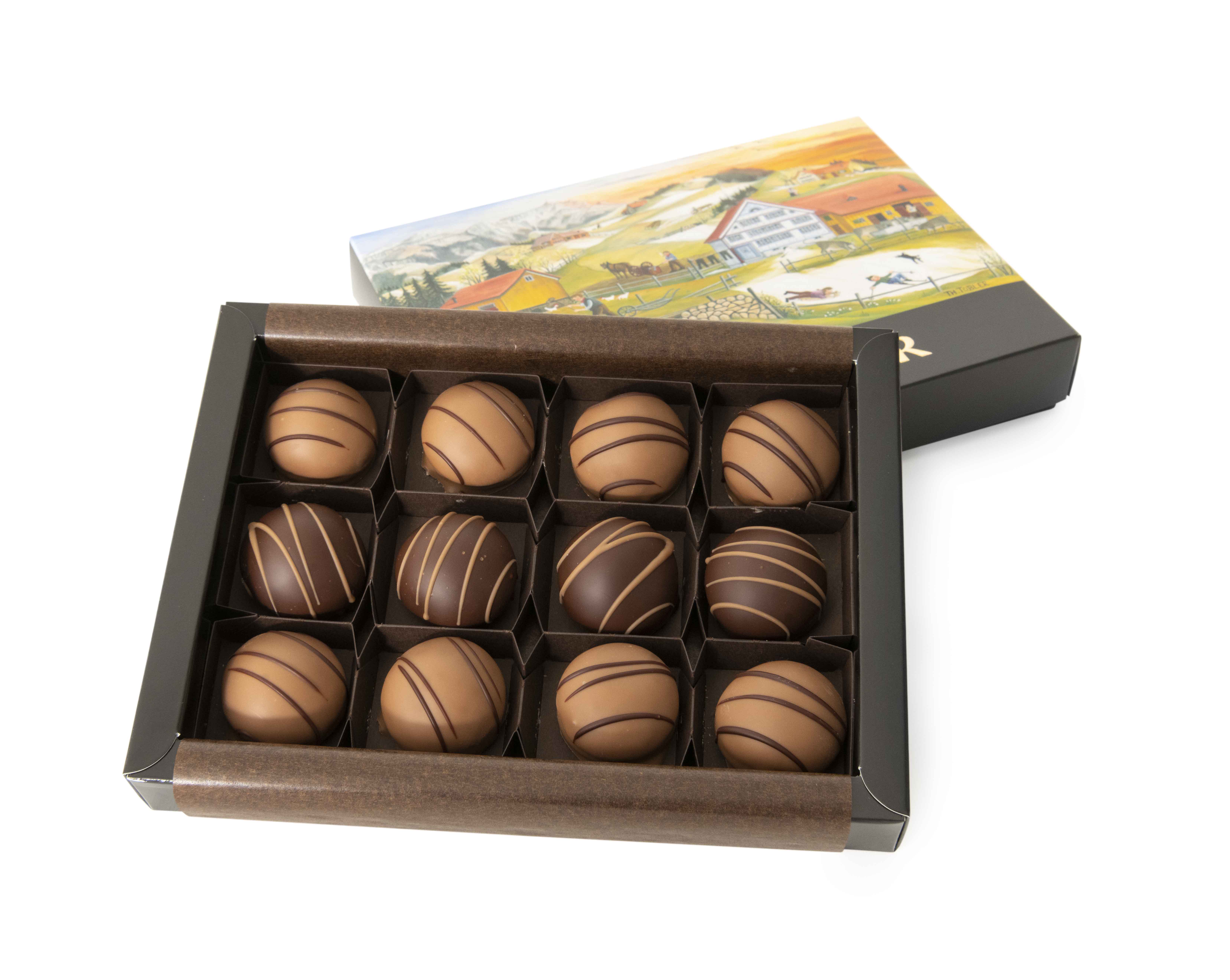 Das Leben ist kurz - weshalb also nicht mit dem Dessert beginnen? Unsere schmucken Biberli-Praliné kommen gleich zu zwölft daher und lassen deinen Gaumen jauchzen. Eine Komposition aus einem Kern mit feinster Mandelfüllung und Lebkuchen – umhüllt mit edler Milchschokolade oder zartherber dunkler Schokolade. Ein neues Geschmackserlebnis exklusiv aus der Chocolat Manufacture Appenzell. Assortiert 8 x Milch + 4 x Dunkel.