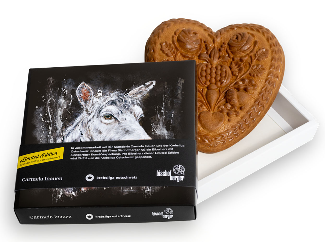 Biberherzen verschenken für einen guten Zweck. In Zusammenarbeit mit der Künstlerin Carmela Inauen und der Krebsliga Ostschweiz haben wir ein Biberherz mit einzigartiger Kunst-Verpackung lanciert. Pro Biberherz dieser Limited Edition spenden wir Fr. 5.00 an die Krebsliga Ostschweiz. Ab sofort mit neuem Sujet "Appenzeller-Gäss".