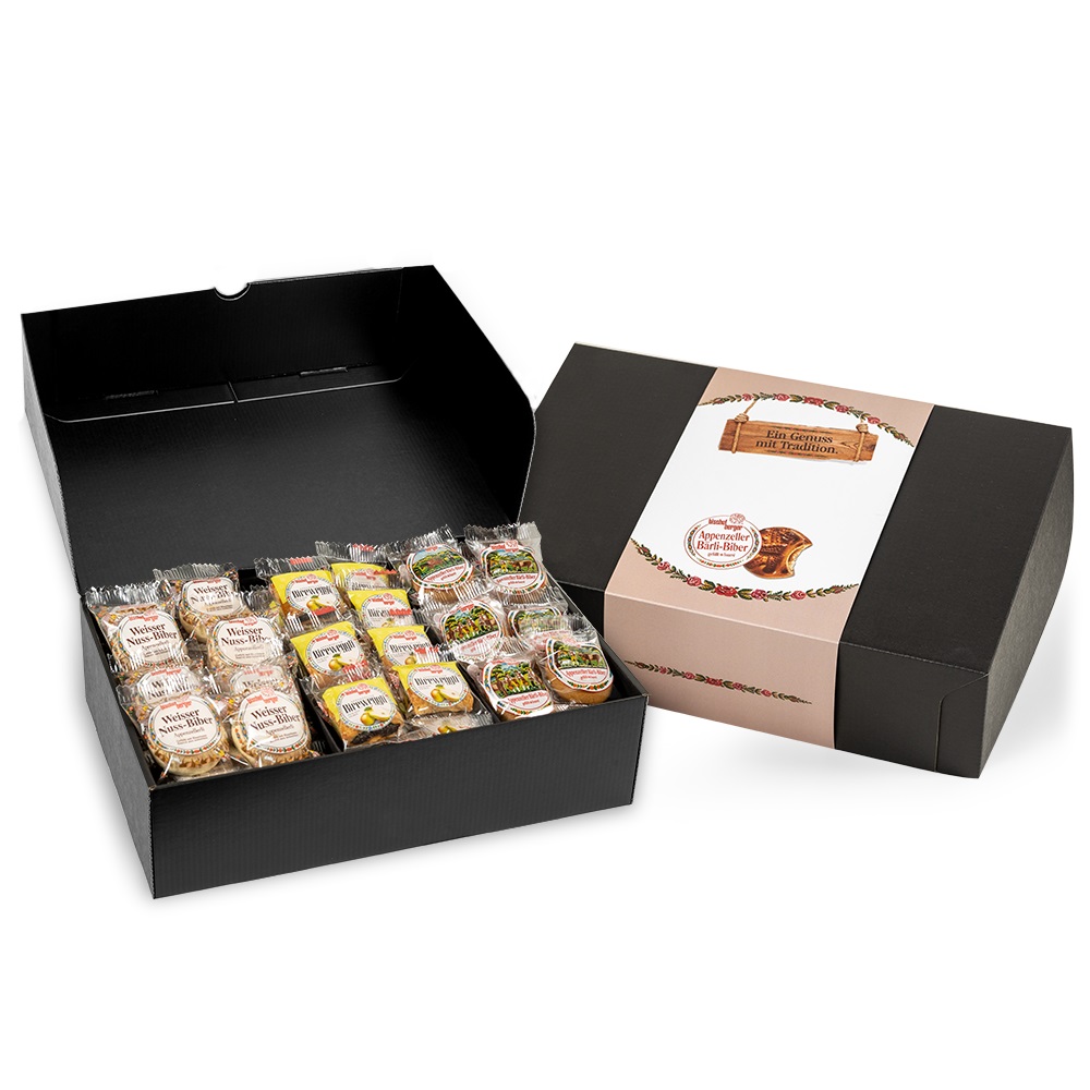 60 x Mini-Genuss gemischt, unsere Kleinen ganz Gross. Geschenkbox Inhalt: 20 x Bärli-Biberli mini, 20 x Weisse Nuss-Biberli mini, 20 x Bireweggli mini.